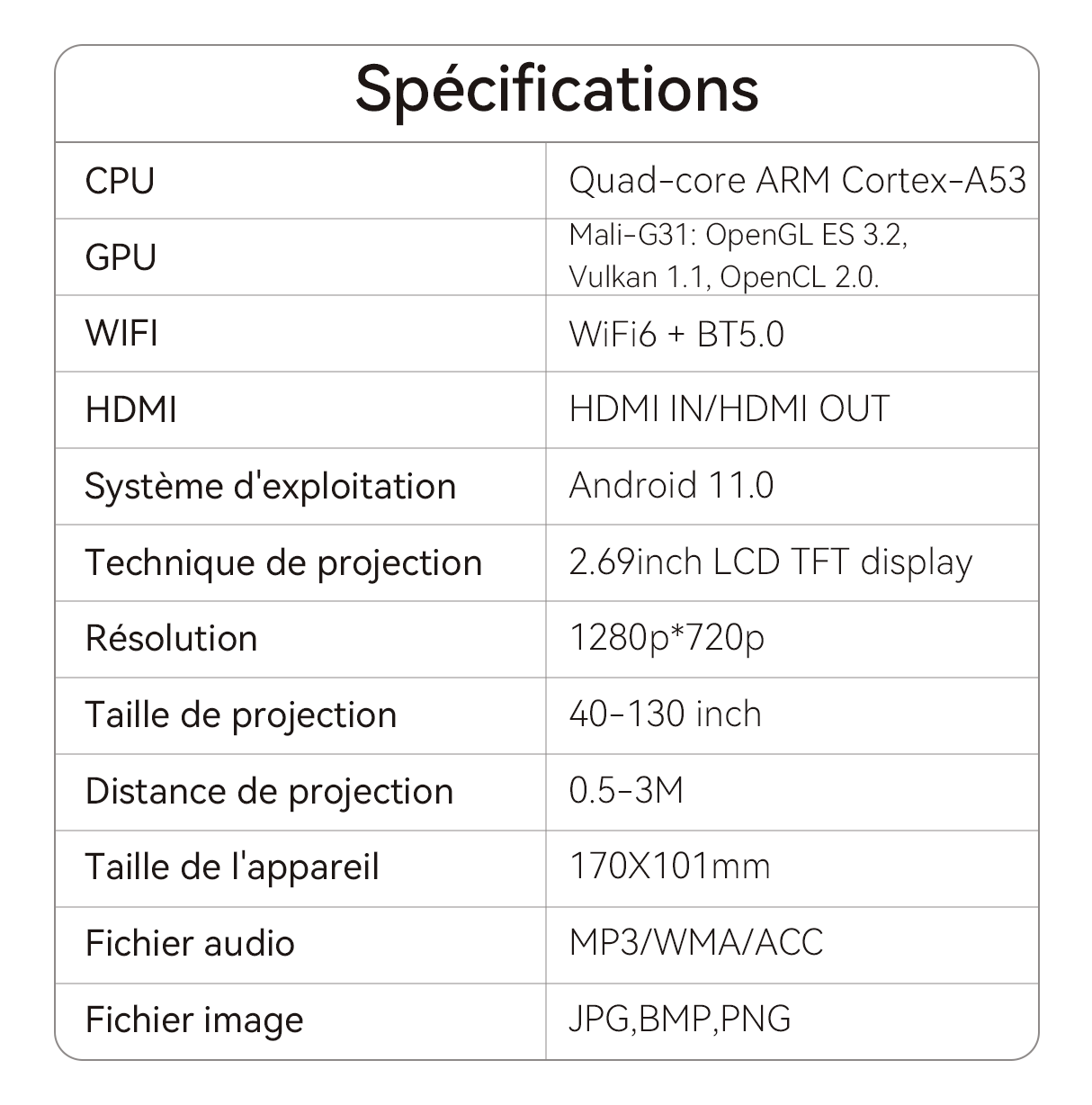 - Distance de Projection Optimale : Il vous suffit de 1,68 mètres pour projeter un écran gigantesque, parfait pour les petits espaces.