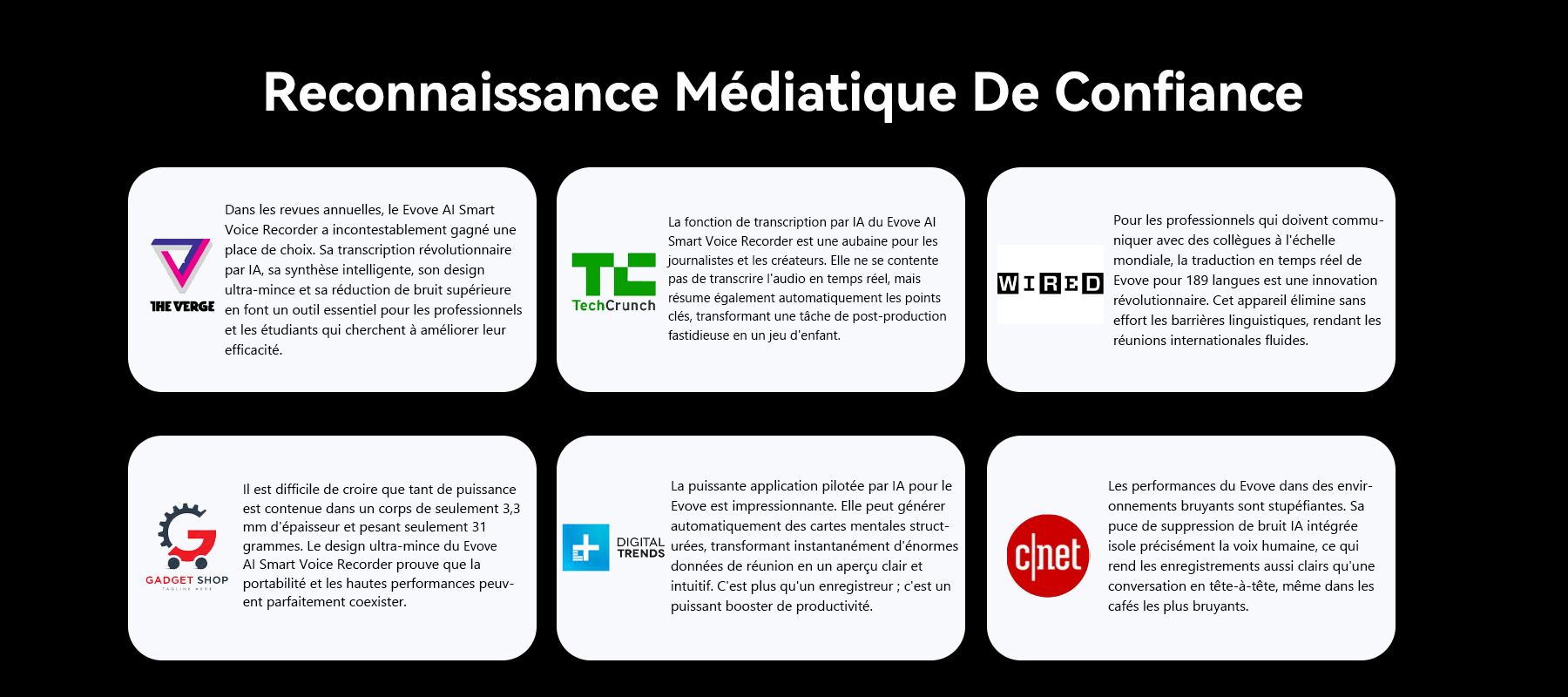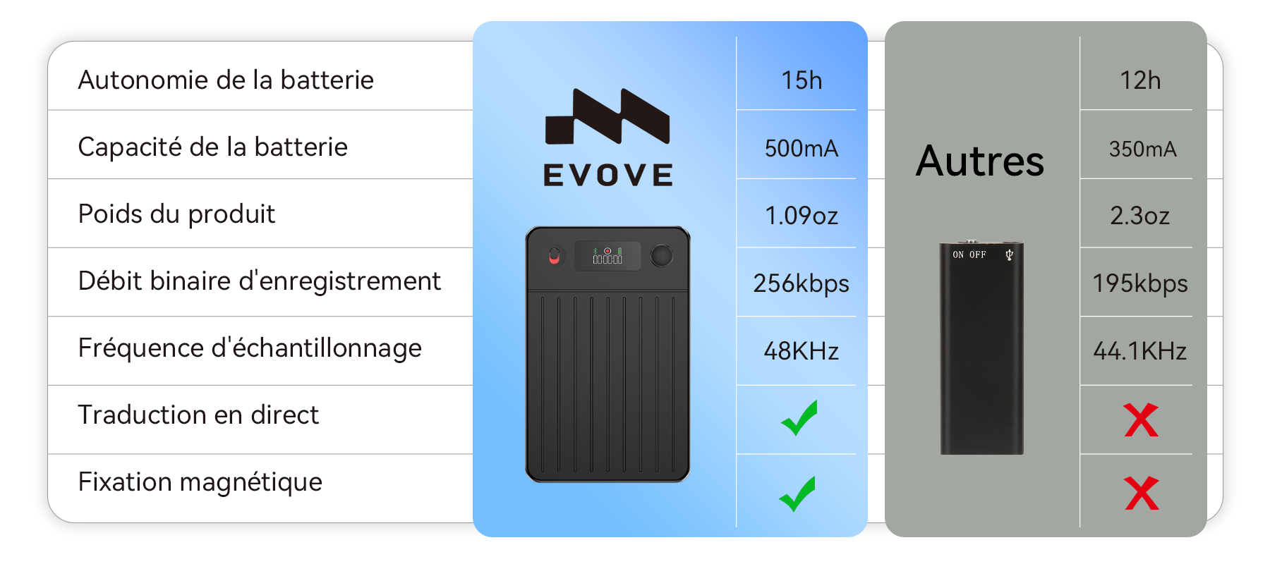 L'Evove AI Smart Voice Recorder est né. Il dispose d'un puissant moteur IA pour la transcription en temps réel et le résumé intelligent, et son corps ultra-mince intègre une technologie de réduction du bruit IA, assurant une qualité audio impeccable. La promesse d'Evove est simple : libérer votre esprit et vous permettre de vous concentrer sur ce qui compte vraiment.
